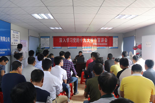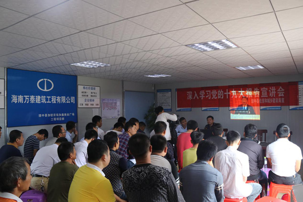 為深入貫徹落實(shí)十九大精神,將十九大精神全面、系統(tǒng)的傳達(dá)給一線工人,按照公司的總體要求和部署,繼11月25日成功舉行第一次十九大精神宣講會(huì)后,海南萬(wàn)泰計(jì)劃將在各項(xiàng)目部以豐富多樣的形式貫徹落實(shí)十九大精神。11月30日,由瓊中縣住建局相關(guān)領(lǐng)導(dǎo)組成的宣講團(tuán)到海南萬(wàn)泰承建的瓊中縣加釵農(nóng)場(chǎng)加鑫商業(yè)廣場(chǎng)項(xiàng)目開展十九大精神宣講會(huì)。項(xiàng)目部全體工人、瓊中縣各工程建設(shè)項(xiàng)目代表參加了宣講會(huì)。