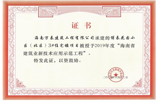 近日,從海南省住房和城鄉建設廳傳來喜訊,由海南萬泰建筑工程有限公司承建的“博泰花園小區(北區)3#住宅樓項目”和“聯合產權酒店項目”榮獲2019年度“海南省建筑業新技術應用示范工程”。