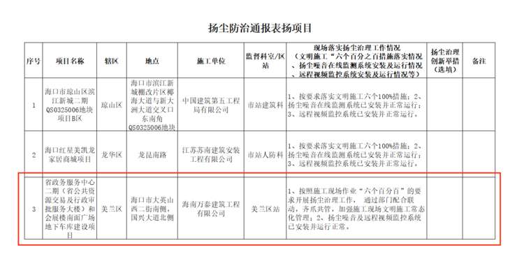 根據(jù)《2021年大氣治理沖刺階段管控措施清單》,海口市住建局對受監(jiān)在建項目工地進行打分考核,列出第一批紅黑榜,對在揚塵防治方面表現(xiàn)突出的前3名受監(jiān)在建項目工地記入海口市建筑工地揚塵治理“紅榜”,對排名在后5名的受監(jiān)在建項目工地記入海口市建筑工地揚塵治理“黑榜”。海南萬泰承建的省政務(wù)中心二期(省公共資源交易及行政審批服務(wù)大樓)和會展樓南面廣場地下車庫建設(shè)項目因按照施工現(xiàn)場作業(yè)“六個百分百”的要求開展揚塵治理工作,通過部門配合聯(lián)動,齊抓共管,加強施工現(xiàn)場文明施工常態(tài)化管理,且揚塵噪音及遠程視頻監(jiān)控系統(tǒng)均以安裝并運行正常等,榮登海口市建筑工地揚塵治理“紅榜”。