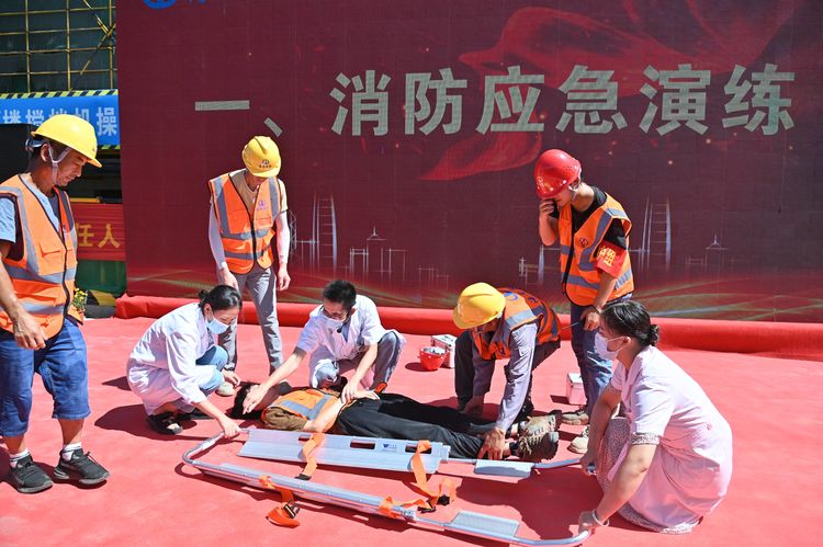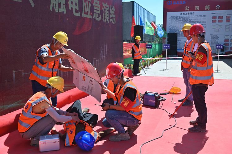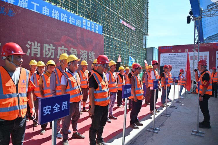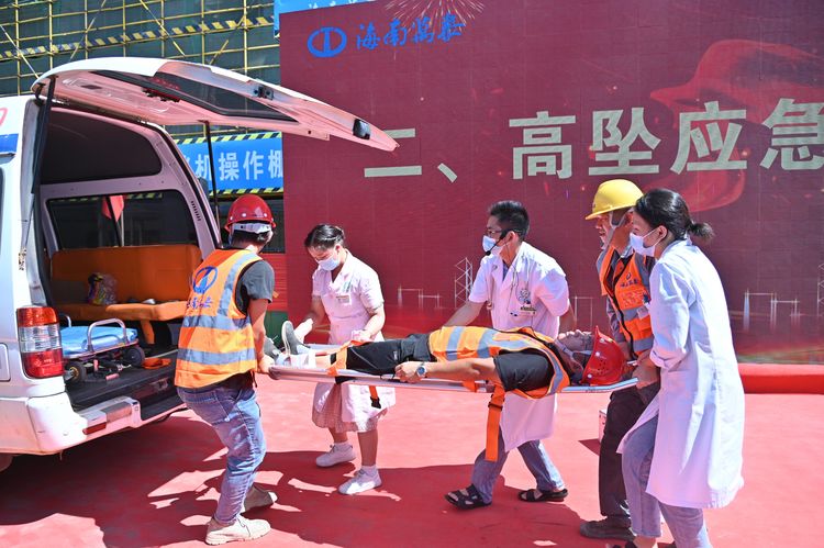 為貫徹落實習總書記關于安全生產重要論述,以黨建引領促進安全生產,全面提升項目質量管理水平,增強安全責任意識,按照上級相關主管部門對開展“安全生產月”活動的通知要求,結合第21個全國“安全生產月”,2022年6月28日,海南萬泰建筑工程有限公司在七彩瀾灣南區商業項目部成功舉辦了2022年“安全生產月”綜合應急演練觀摩會。省住建廳安全行業專家劉輝輝,澄邁縣住房和城鄉建設局莫丁,澄邁縣應急管理局冼厚霖,澄邁縣質監站王廣彬,中豪威爾房地產有限公司甲方代表孫志明,海南藍城君潤科技有限公司副總經理陳自衡、工程部經理張凡春,杭州巨烽建設工程項目管理有限公司總監朱冬風,公司常務副總經理顏利、副總經理吳坤芳等相關人員參加本次觀摩會。澄邁縣老城消防救援特勤站、同和醫院友情協助開展本次綜合應急演練。
