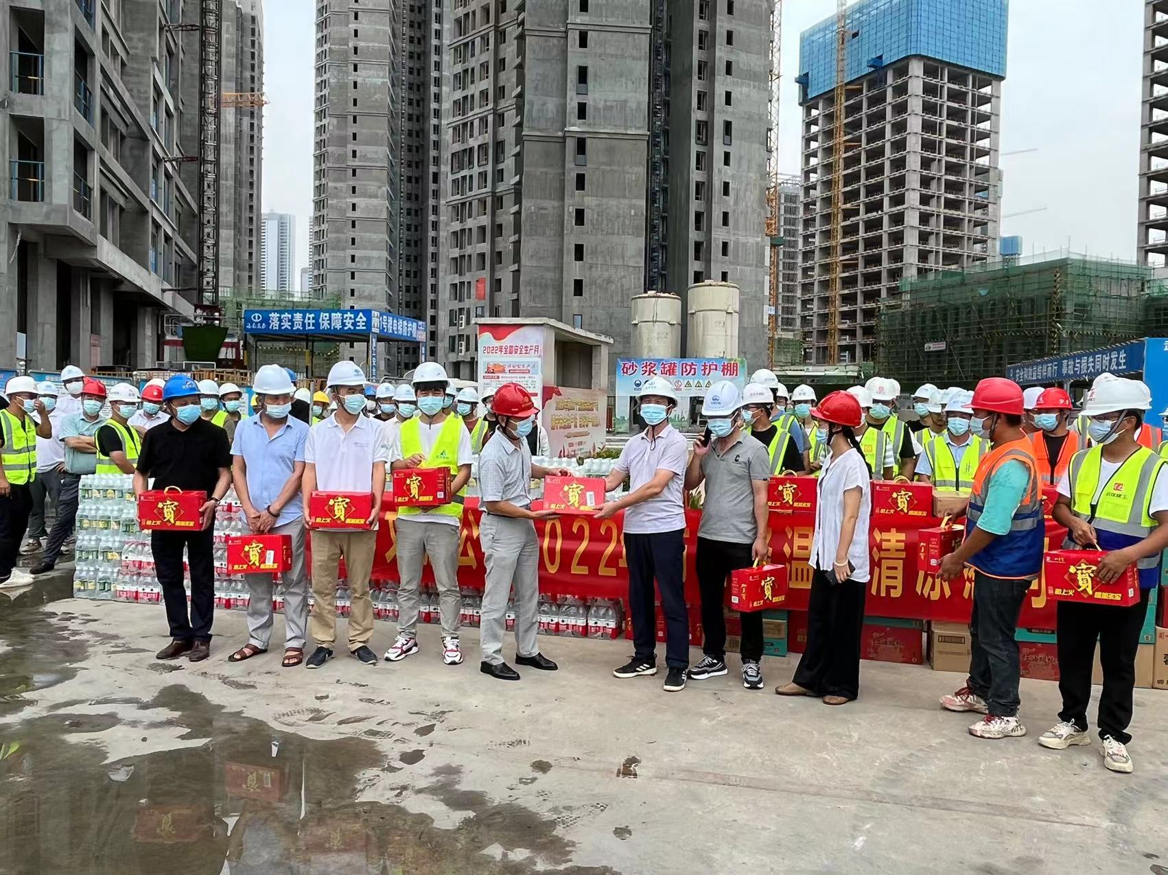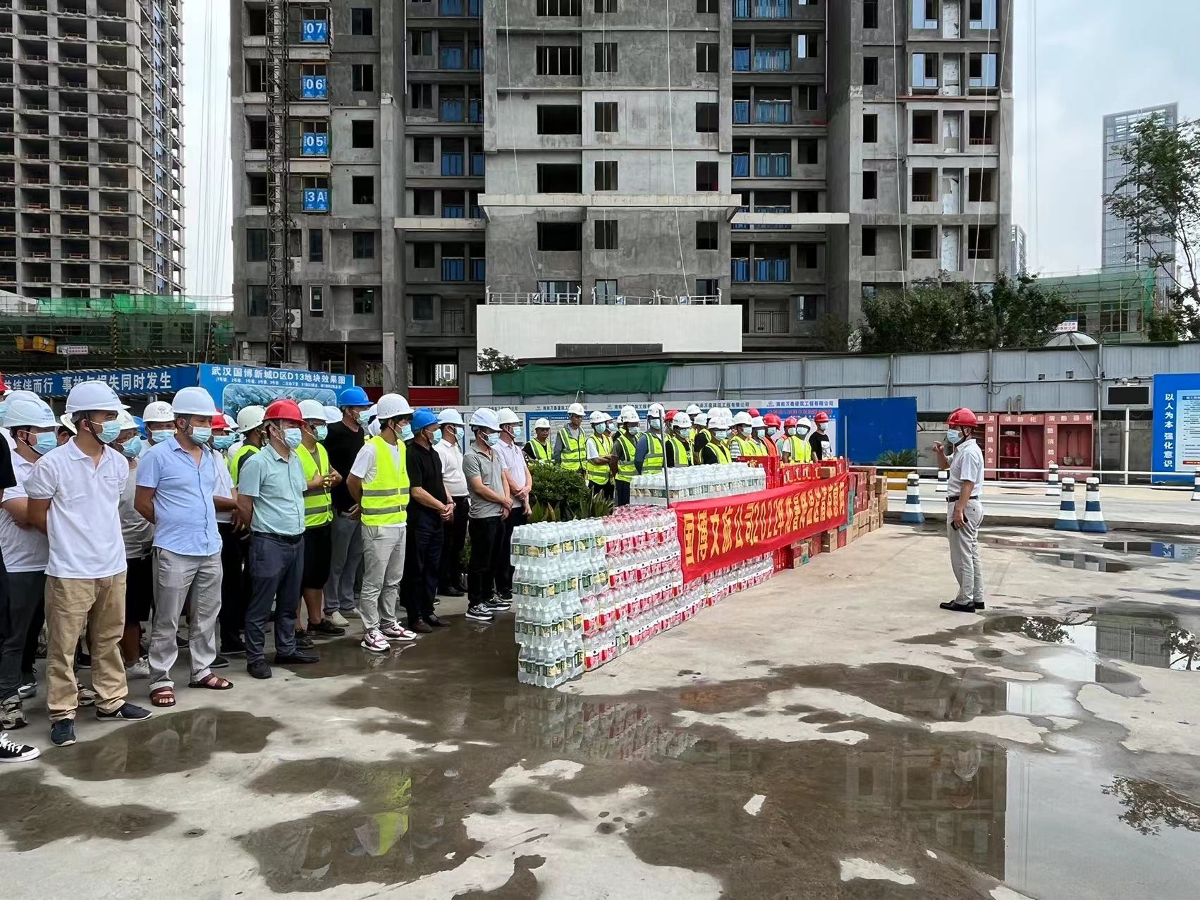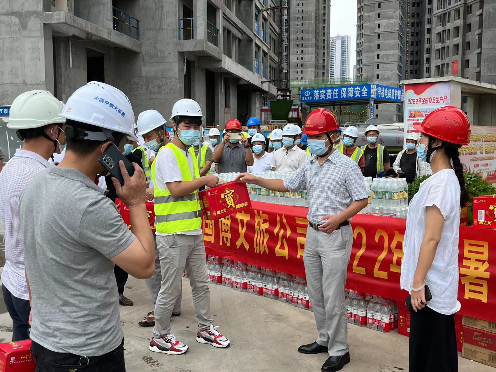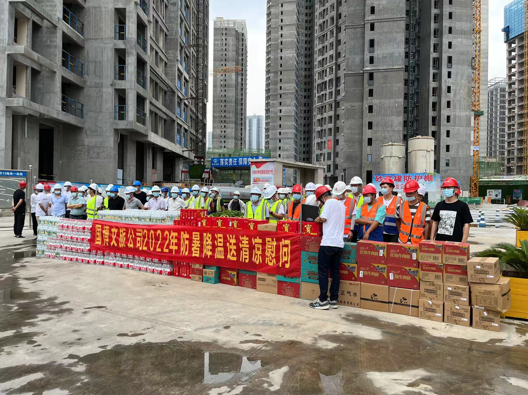 夏日送清涼,真情沁人心。2022年7月28日,武漢國博文旅公司在武漢國博新城DⅡ、D13、D14、C2、C4地塊成功舉辦2022年“夏送清涼”一線工人慰問活動。武漢國博文旅副總經理江立偉、質安部張部長,海南萬泰湖北分公司承建的武漢國博新城D區D13地塊一標段項目經理陶少武以及中鐵大橋局,中國中冶,上海建工、武漢建工,天時建安,中鐵四局,方正監理,天衡監理,武院監理等十四家公司相關人員參加本次慰問活動。