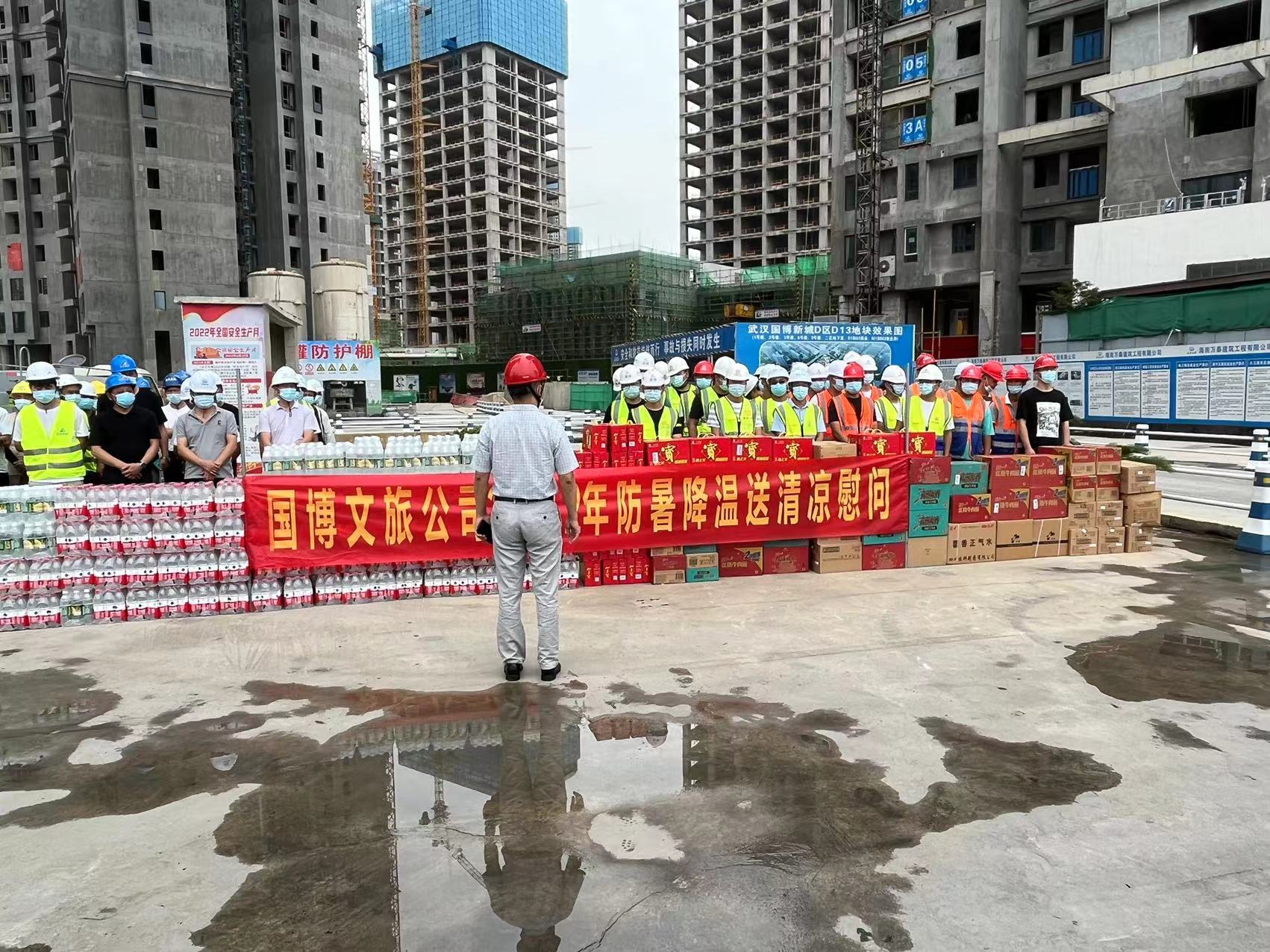 活動上,武漢國博文旅副總經理江立偉對在炎熱天氣里仍然堅守在一線崗位上的廣大工友們表示慰問和感謝,并叮囑大家注意防暑降溫,提高防范意識,保護好自身安全。同時要求所有項目管理人員關心工地一線工人的身體健康,認真做好防暑降溫工作,嚴格落實各項安全生產措施,確保安全生產工作有條不紊。
