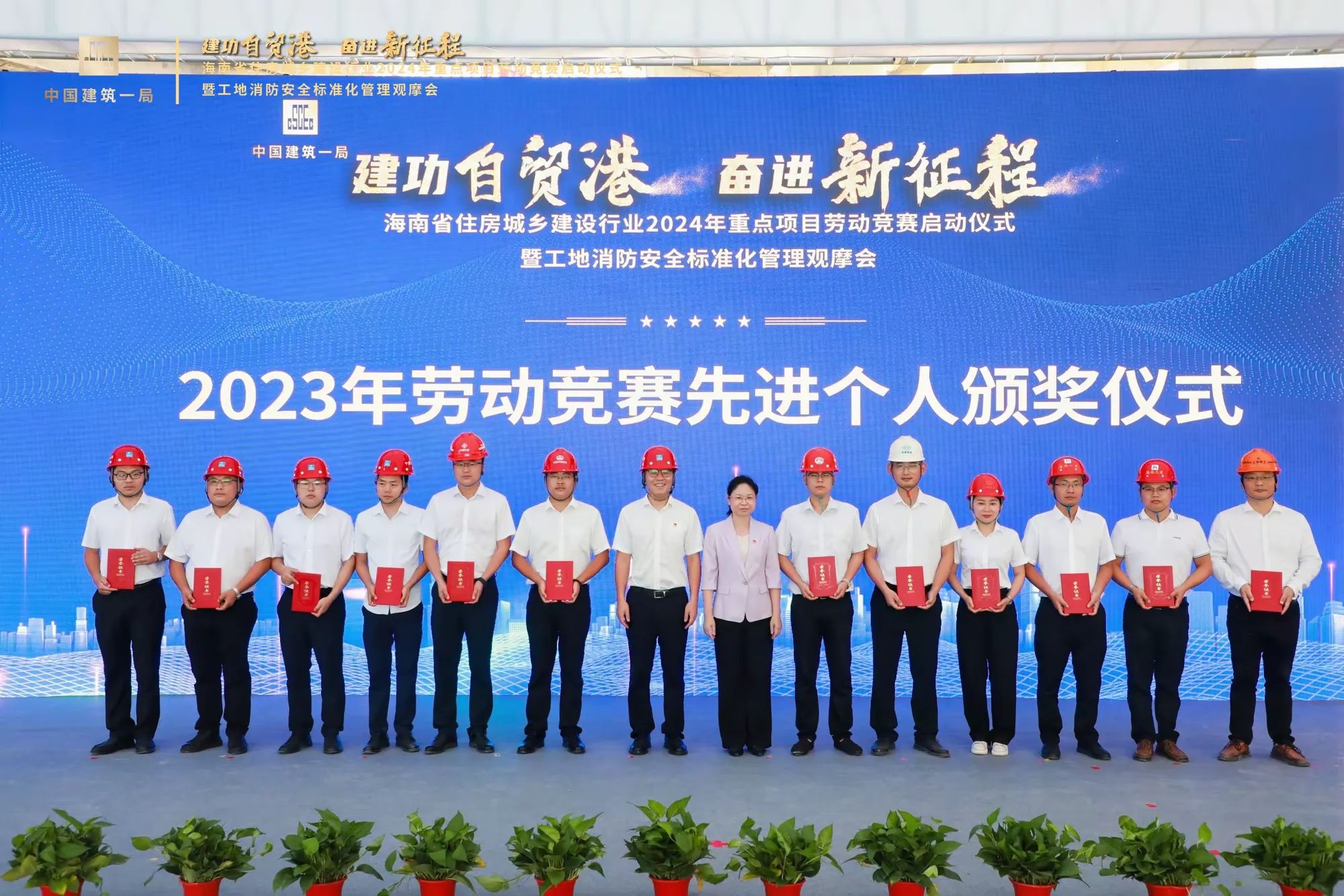 在啟動儀式現(xiàn)場,公司林慧同志作為29名海南省住房城鄉(xiāng)建設(shè)行業(yè)2023年重點項目勞動競賽“先進個人”之一上臺領(lǐng)獎,張豪杰同志作為公司代表上臺進行參賽單位宣誓。本次勞動競賽以“七比一創(chuàng)”為主要內(nèi)容,即“比黨建引領(lǐng)、比工程進度、比工程質(zhì)量、比安全生產(chǎn)、比科學(xué)管理、比技術(shù)創(chuàng)新、比文明施工、創(chuàng)優(yōu)質(zhì)工程”,進一步激發(fā)廣大職工不斷提升自身能力水平,勇于奉獻、干事創(chuàng)業(yè)的熱情。