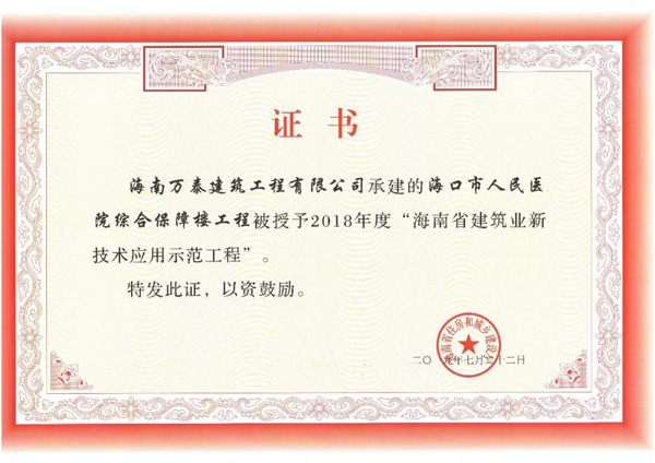 近期,海南省住房和城鄉(xiāng)建設(shè)廳下發(fā)了《關(guān)于公布2018年度海南省建筑業(yè)新技術(shù)應(yīng)用示范工程的通知》,由我司承建的海口市人民醫(yī)院綜合保障樓項(xiàng)目,獲評“2018年度海南省建筑業(yè)新技術(shù)應(yīng)用示范工程”。