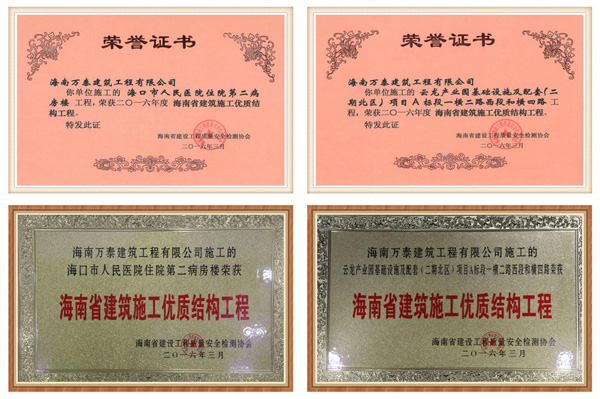 2016年3月,由海南萬泰建筑工程有限公司承建的“海口市人民醫院住院第二病房樓”及“云龍產業園基礎設施及配套(二期)項目”工程被海南省建設工程質量安全檢測協會評為《海南省建筑施工優質結構工程》榮譽稱號。