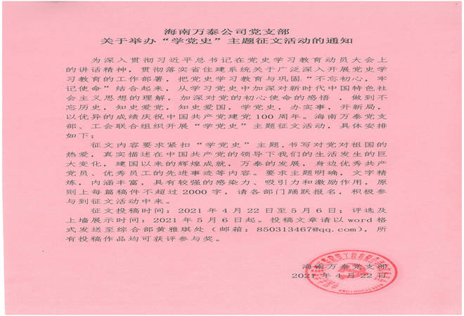 自4月22日起,海南萬泰黨支部、工會聯合開展“學黨史”主題征文活動。活動通知發布后,廣大黨員、職工踴躍報名、積極投稿,參加了此次活動。