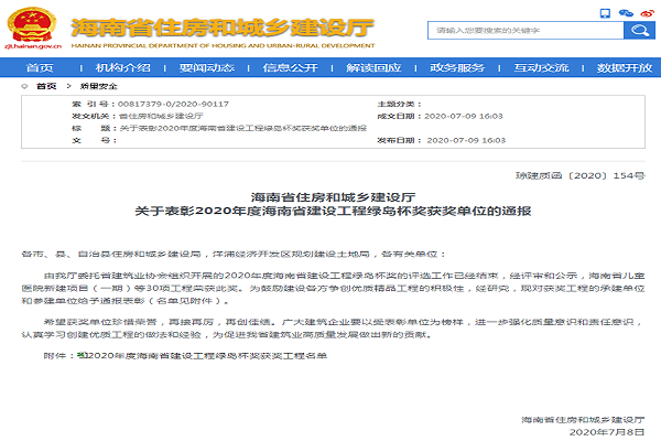海南萬泰清能·麗景灣一期建安工程喜獲省優質工程“綠島杯”獎